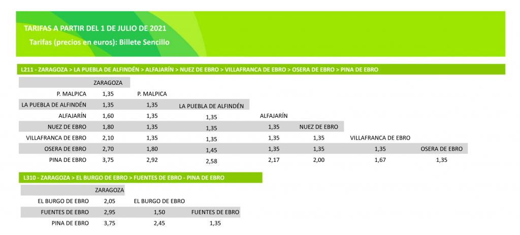 A partir del jueves 1 de julio de 2021 se revisa la tarifa Zaragoza-Pina de Ebro
