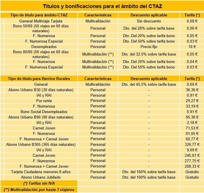 En cuanto al sistema tarifario, la renovación y mejora del servicio no implicará un aumento del coste del mismo. Por el contrario, el Mapa Concesional prevé mantener los actuales títulos y bonificaciones del CTAZ para el servicio metropolitano y los del Ayuntamiento de Zaragoza para los vecinos de barrios rurales.